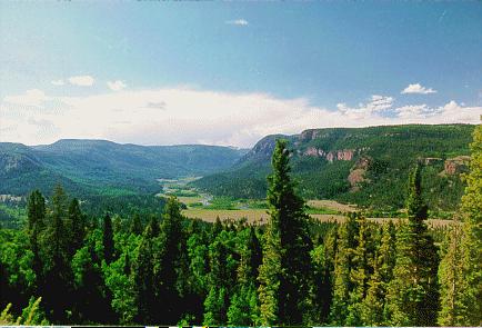 | Another photo, albeit from a higher vantage point, of the Conejos River. Here the river valley is of the classic U-shaped, glaciated type. This is the view from Colorado Highway 17, which runs from near Antonito, Colorado to Chama, New Mexico. |