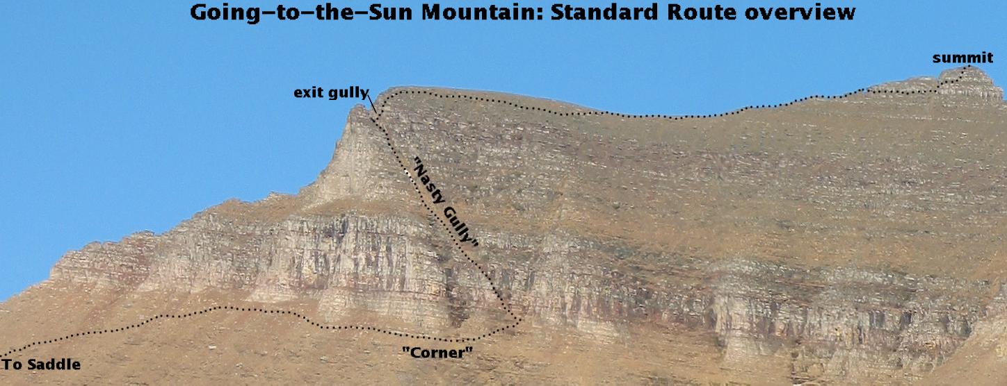 | Overview of upper part of diagonal chute variation of Going-to-the-Sun Mountain's West Face route. The diagonal chute, marked "nasty gully", climbs around 1000 feet, and tops out at the base of a pitch or so of class 4 scrambling. From the scramble, it's mainly a walk to the summit, with some class 3 at the summit block. |