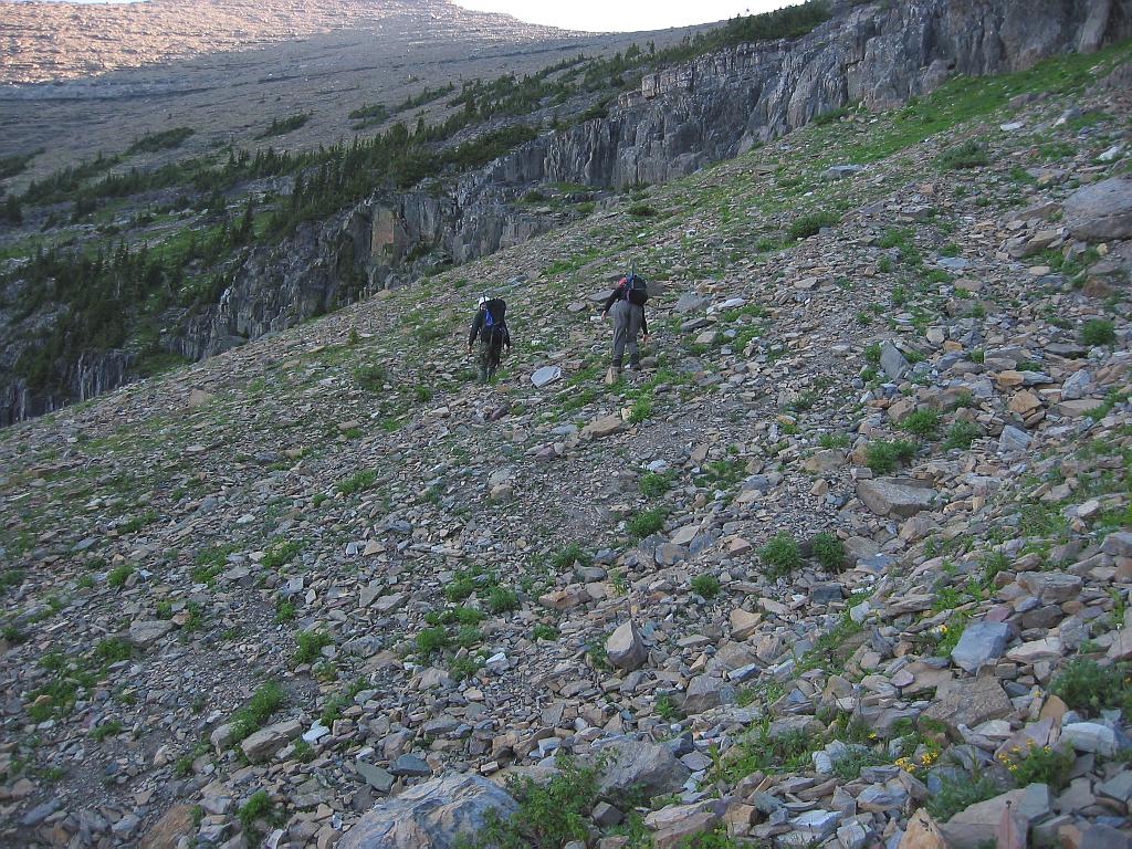 Kim and Robert making their way up the maddening talus slopes below the black diorite cliff band.