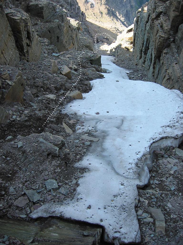 View from 3/4 of the way up the diagonal chute. WIthout adequate snow cover, the loose talus can be pretty treacherous on the 45° slopes.