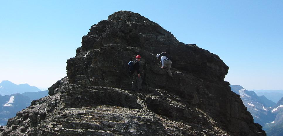 Kim and Morgan scrambling to the summit block of Going-to-the-Sun Mountain.