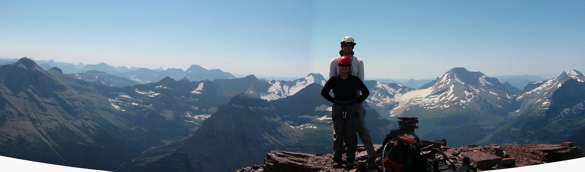 Kim and Morgan and panoramic view to south from summit of Going-to-the-Sun Mountain.