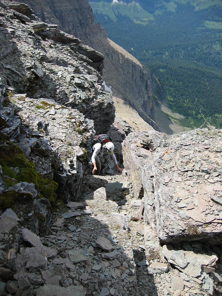 Morgan downclimbing the class 4 section above the diagonal chute on Going-to-the-Sun Mountain.