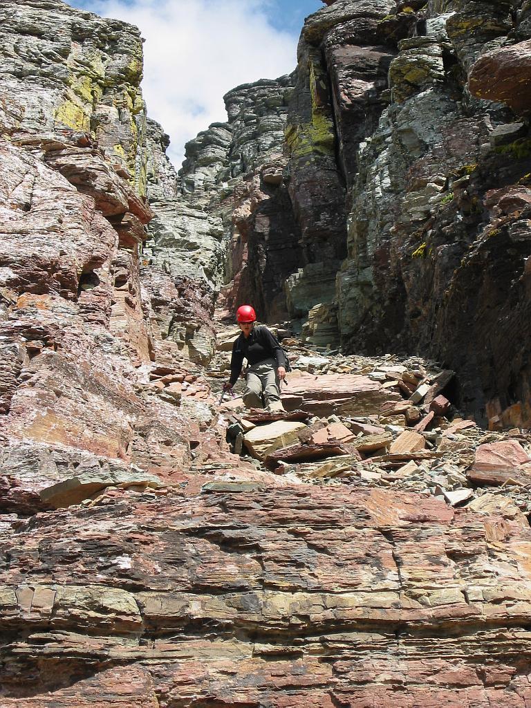 Kim descends rotten talus at the base of the diagonal chute. We took turns descending, for fear of knocking rocks on each other.