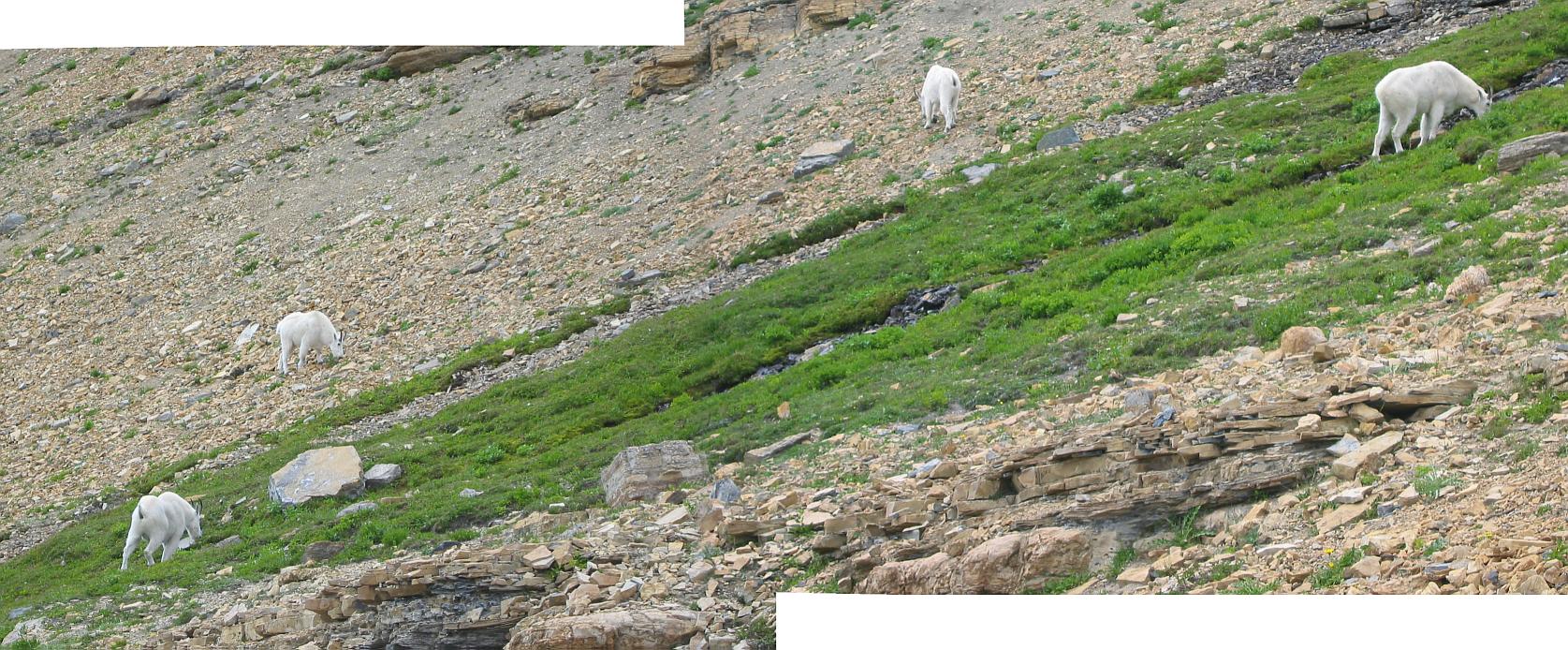 A group of four mountain goats on the other (Sunrift Gorge) side of Siyeh Pass.