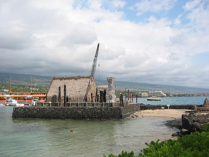 Kona's harbor. The thatched hut is some kind of Kamehameha tribute, of which there are many. The boat-shaped hotel in the background is our hotel, the Royal Kona Resort.