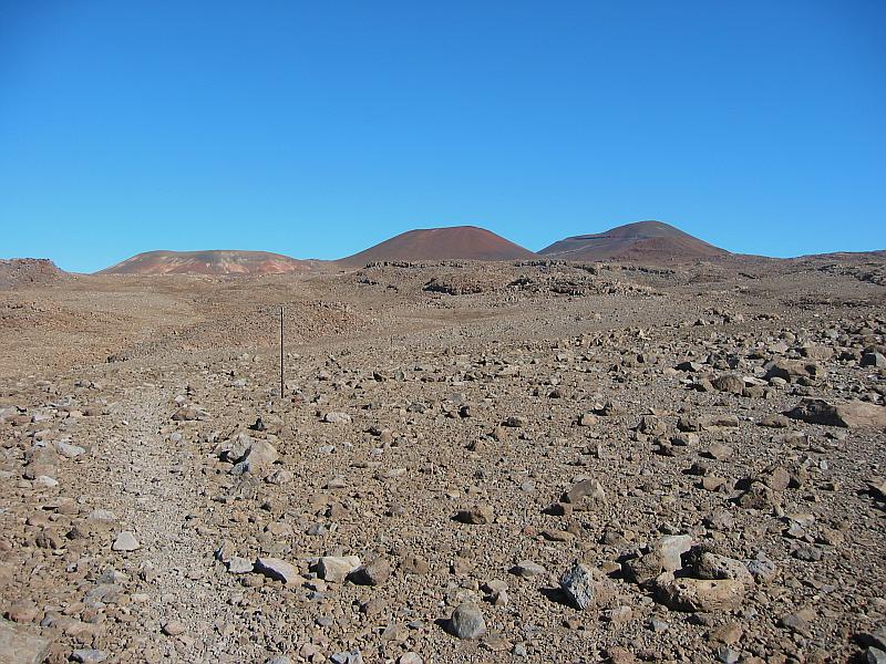 The true summit (right) becomes visible for the first time at the 12200-foot level on the Mauna Kea Trail.