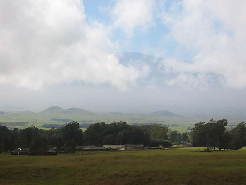Mauna Kea, 15 miles to the south, towers through the fog.