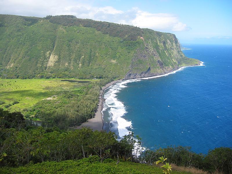 | If the weather is foggy at the head of the valley, it is just as often perfect at the mouth. Here is the "postcard view" from the Waipi'o Valley Overlook. 90% or more of visitors to the area go no further than this. They're missing out, yes, but this is certainly a pretty view. |