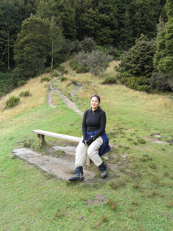 Kim resting on a bench on the Rob Roy Glacier hike.