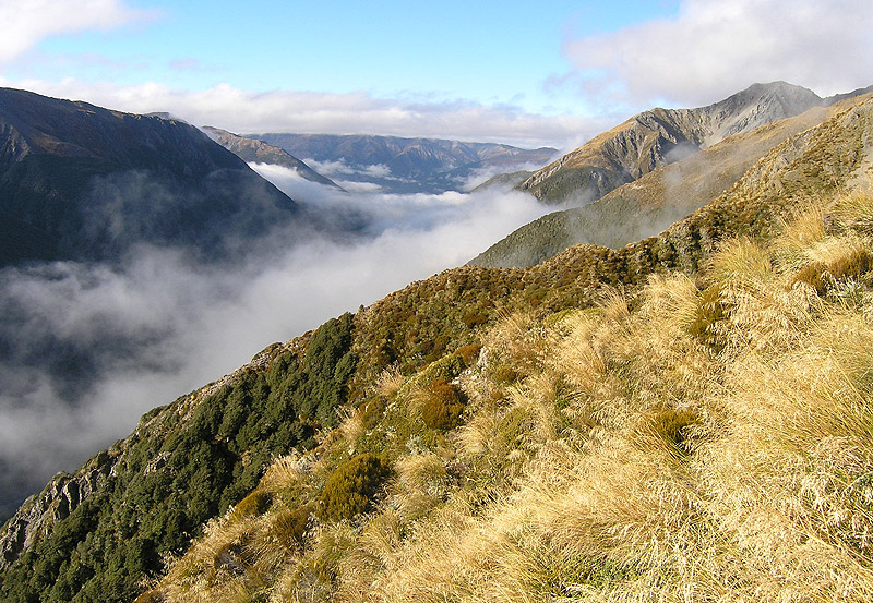 View to the south from Scotts Track, showing the foggy valley around Arthurs Pass.