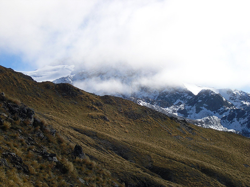 Climbers in the distance ascending Scotts Track with cloud-shrouded Mount Rolleston.