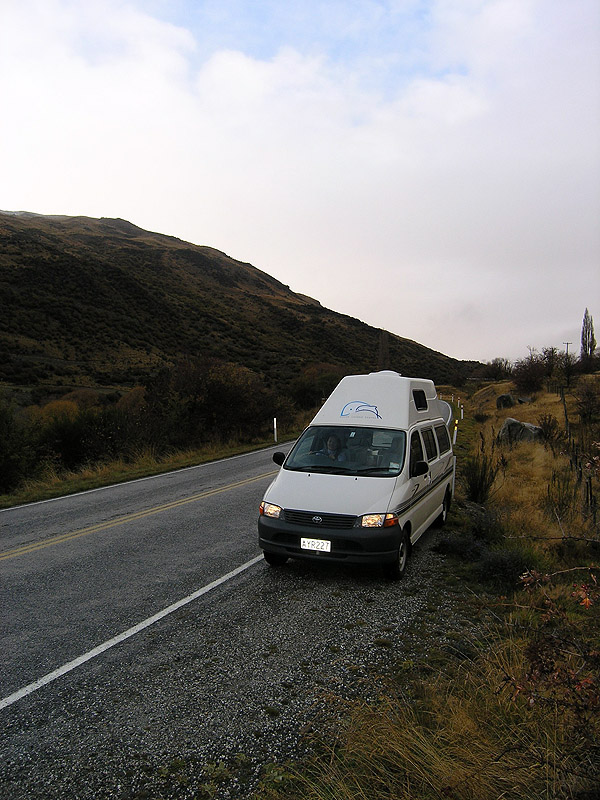 Parked on the scenic Crown Range highway, which connects Queenstown to Wanaka.