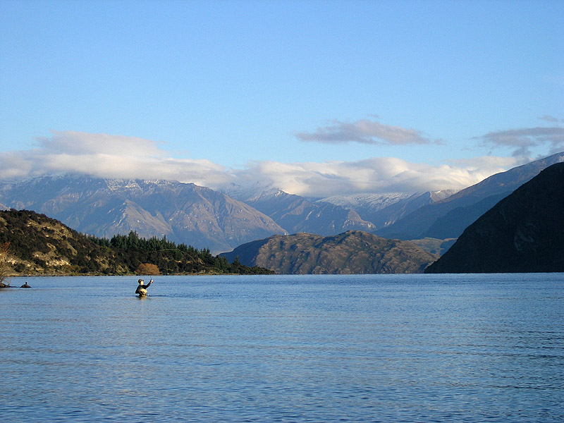 Morgan flycasting on Lake Wanaka at the mouth of the Clutha River. The scenery was stunning, but the fishing was not!