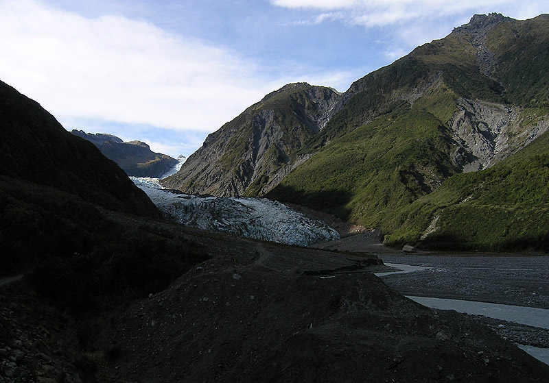 Toe of the Fox Glacier. From the 12,000+ foot summit of Mount Cook, the glacier descends nearly to sea level.