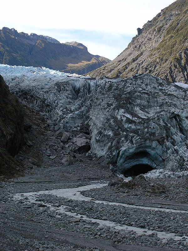 Toe of Fox Glacier, with eerie ice cave. Ice chunks calved from the glacier almost continually on this sunny day.