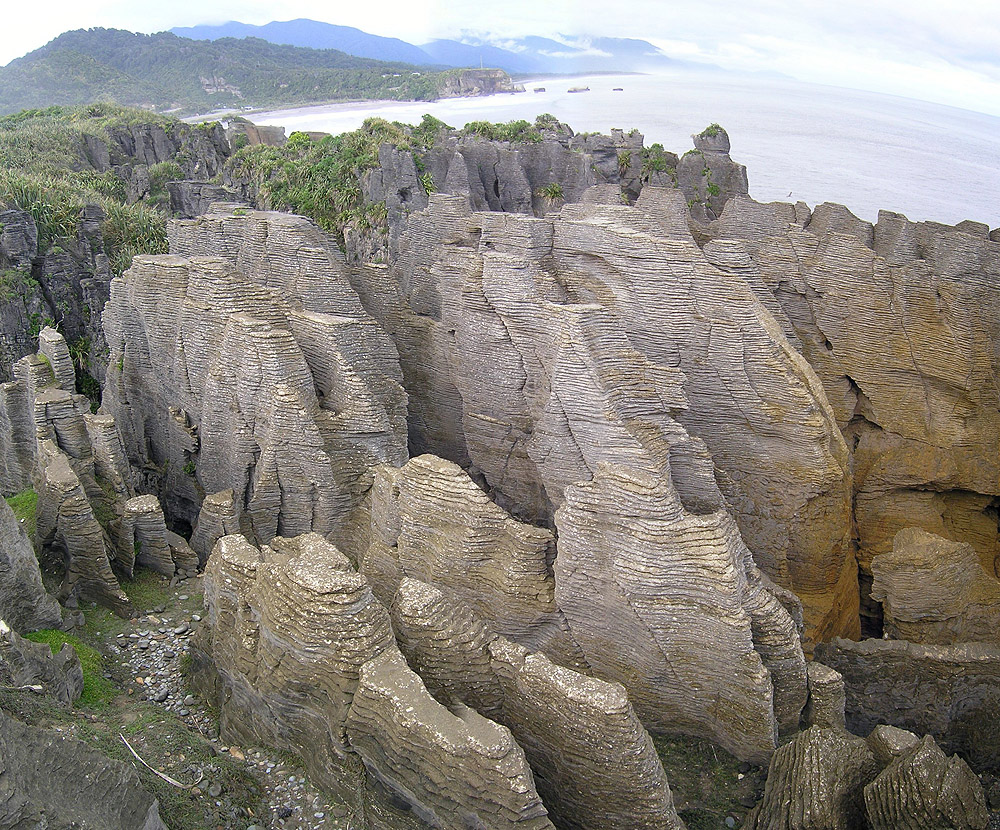 Panoramic view of the famous "Pancake Rocks" near the town of Punkaiki. They are alternating layers of limestone (hard) and mudstone (soft).