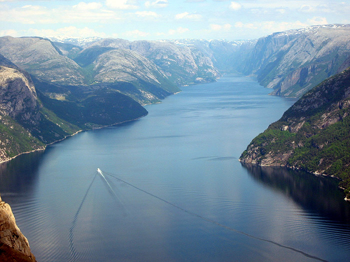 A passenger ferry plies its way down Lysefjord toward Kjerag, on the right, which looms above the town of Lysebotn.