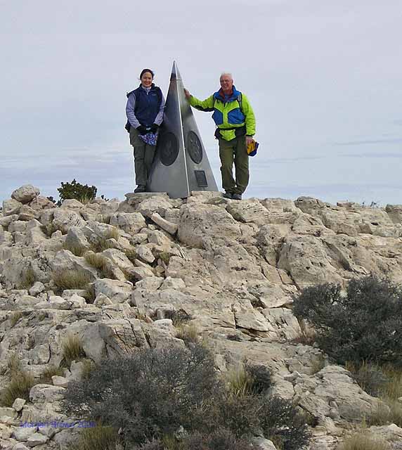 The summit pinnacle was placed in 1958, apparently by Boy Scouts, and was sponsored by American Airlines. It appears to be a frame, covered in stainless steel and anchored in concrete.
