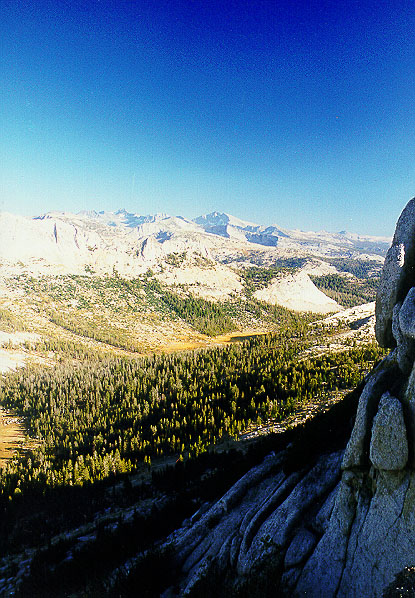 Cathedral Pass and the Cathedral Fork of Echo Creek, photographed from Tresidder Peak. If the photo weren't overexposed, you'd see the Echo Peaks on the left, Matthes Crest further south. Notice Echo Lake in the valley. I suppose the big peak in the distance is Mount Clark.