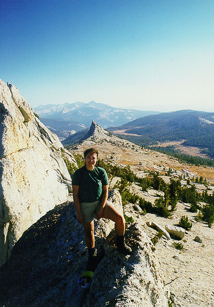 Kim from Tresidder Peak, looking south. Notice the blood on her left knee! I wouldn't have climbed the last part if she hadn't told me it was possible.