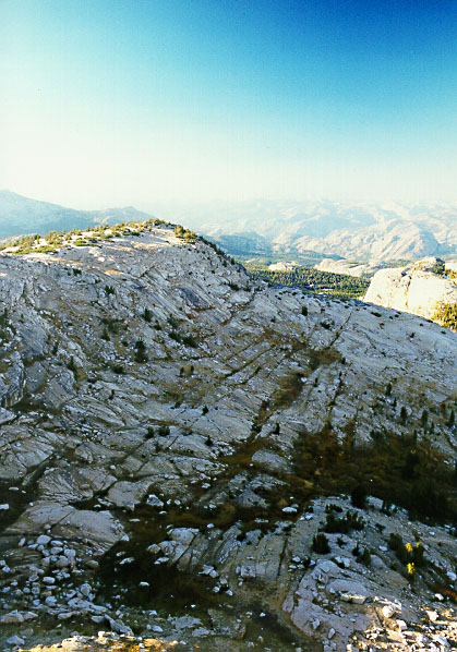 | Looking northwest from Tresidder Peak. The long, regular, linear fracture patterns made for an interesting composition. On the far right, notice Mendicott Dome. There are two hanging lakes near the top which must be fantastic campsites. |