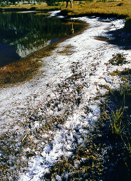 | Fascinating "ice garden" along the shore of Upper Cathedral Lake. These must coalesce from dew, and probably also wind spray. It's cold up there this time of year, but certainly within the comfort range of "3 season" camping gear. |