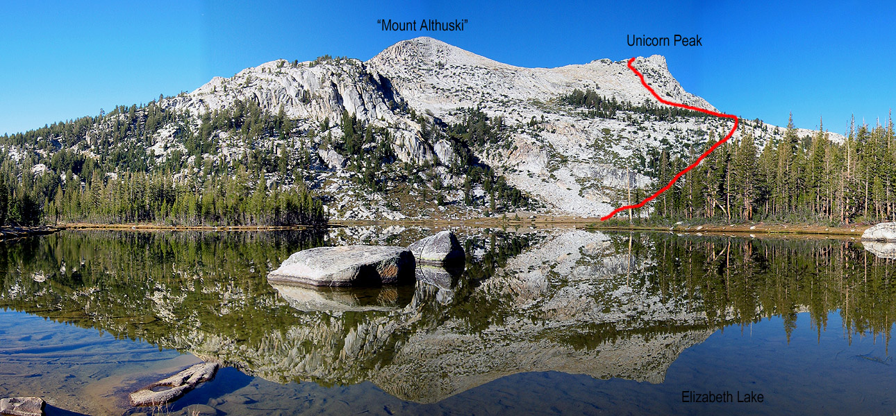 Panoramic image of Unicorn Peak (right) and Mount Althuski (left) reflected in Elizabeth Lake.