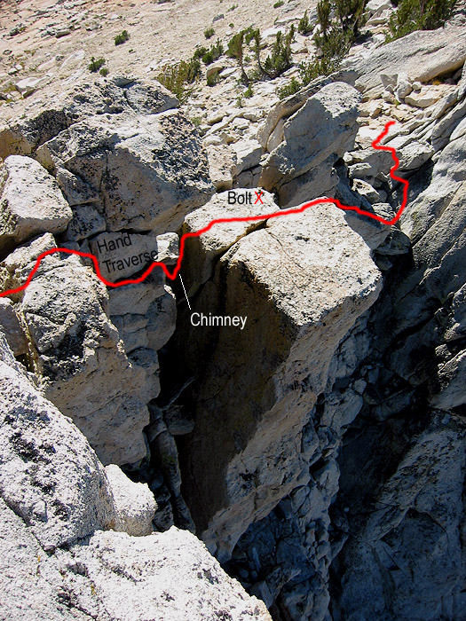 | Route up Unicorn Peak's north summit from the north summit. Climb steep class 3/4 to the large platform with a rusty bolt. From there, descend a few feet into a "chimney", squeeze under a boulder and make an exposed hand traverse. Follow the path of least resistance (class 3/4) to the summit. |