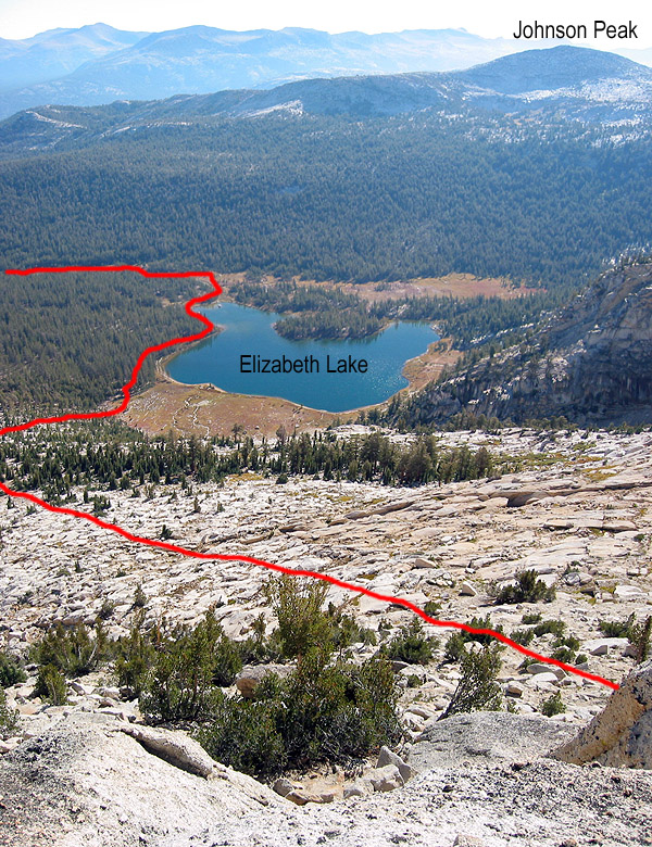 Elizabeth Lake and the endless slabs on Unicorn Peak's east slopes.