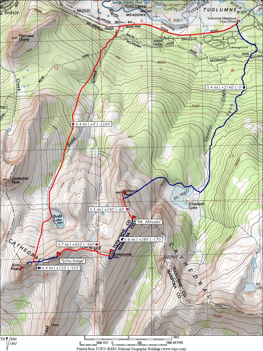 Tripmap of my Cathedral Range traverse. Began and ended at the Tuolumne Grill parking lot.
