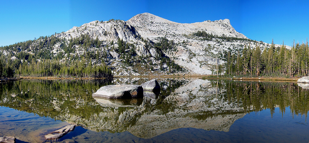 Panoramic image of Unicorn Peak (right) and Mount Althuski (left) reflected in Elizabeth Lake.