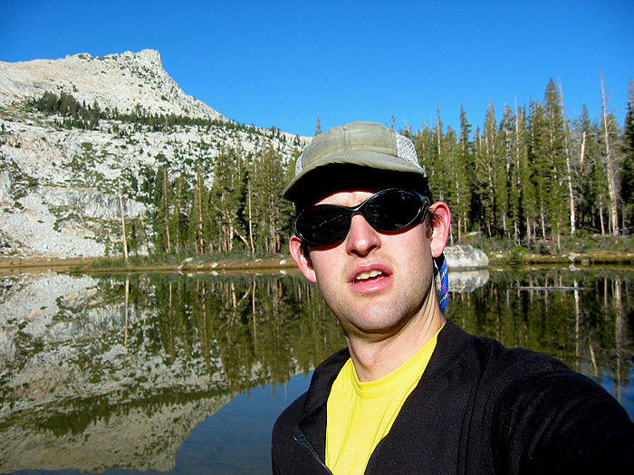 Happy climber in the cold air near Elizabeth Lake with Unicorn Peak in the background.