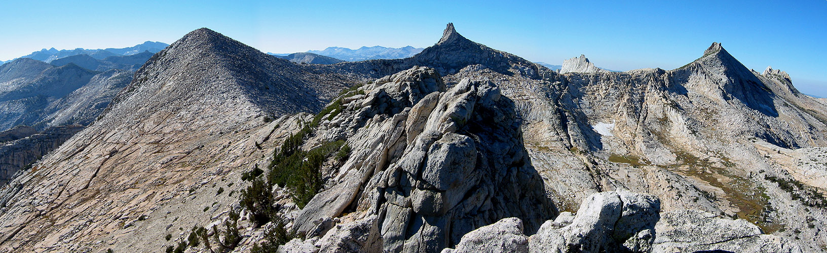 From left to right: Mount Althuski, Matthes Crest, Echo Ridge, Echo Peaks. Taken from north summit of Unicorn Peak.