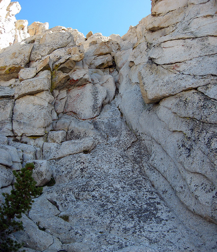 View up lower portion of "class 4" route up Cockscomb. More like 5.2-5.5 by today's standards, depending on which direction you take.