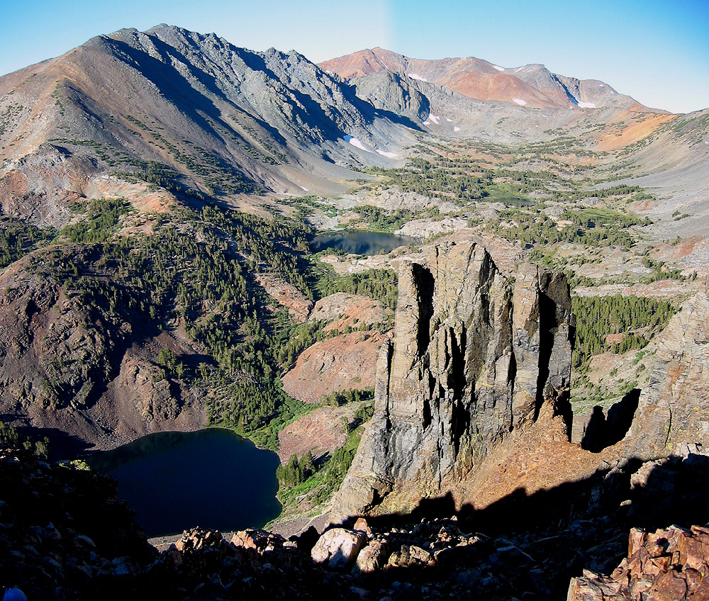 | View to the west from about a third of the way up Dunderberg's southwest ridge. Notice the prominent diorite tower which is just off the main ridge crest. The lower prominent lake is Blue Lake; the higher is Cooney Lake. The smaller Frog Lakes are hidden even higher. Black Mountain is the prominent peak on the left. |