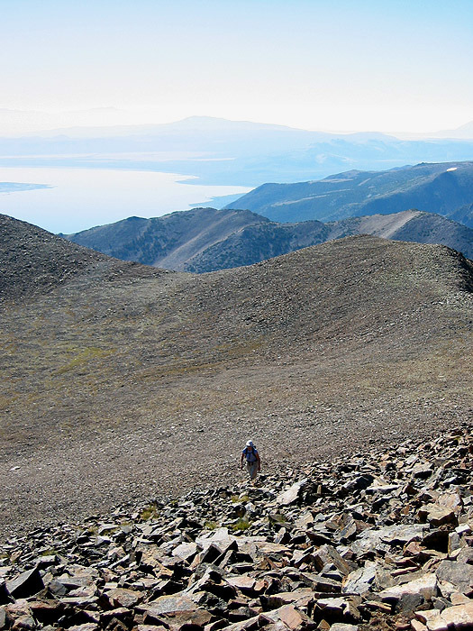 Kim climbing the final stretch to the summit of Dunderberg Peak. Mono Lake in the background.