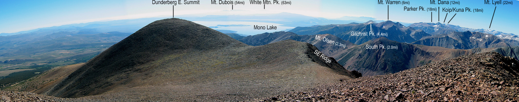 Annotated panoramic image to the south and east from Dunderberg Peak. Dunderberg's East Summit is almost due east, while Koip and Kuna Peaks are almost due south.