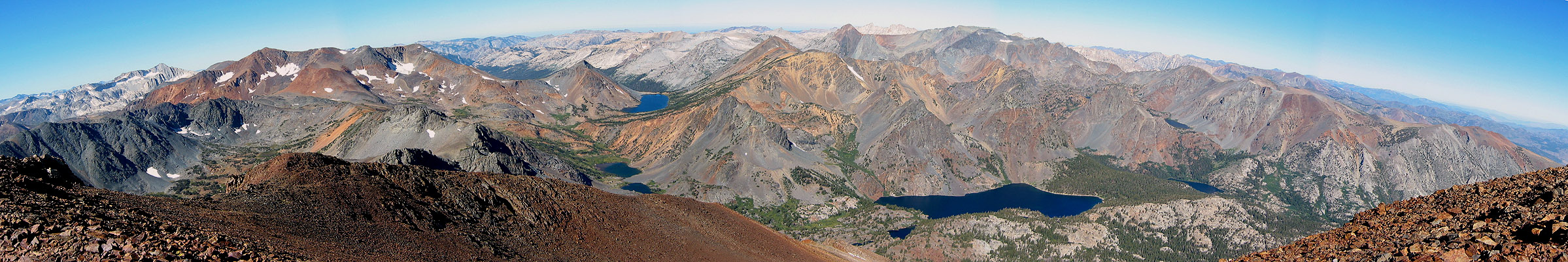 | Panoramic view from southwest (left) to northwest (right). Mount Conness (12,599') is the prominent light granite peak on the left. Excelsior Mountain (12,440'+) is the tall red-colored peak to Conness's right. The various multi-hued peaks and beautiful lakes of the Hoover Wilderness occupy the image's entire foreground. Virginia Peak, in northeast Yosemite NP, is the prominent "plug" of reddish-black rock pasted on top of a diorite/granite background. This peak is an excellent example of a "roof pendant", a remnant raft of old meta-sedimentary rocks floating on top of an intruded granite batholith. |