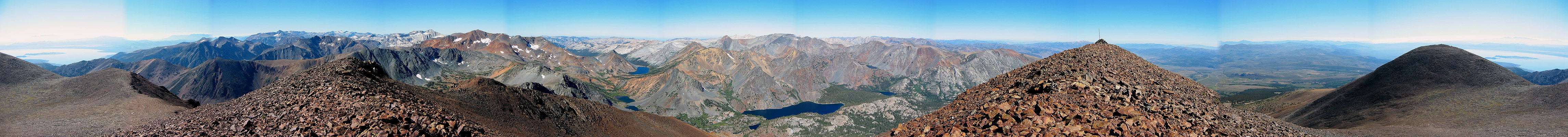 360 ° panoramic view from Dunderberg Peak's summit. Left hand side of the image is ESE, or roughly a bearing of 110 °.