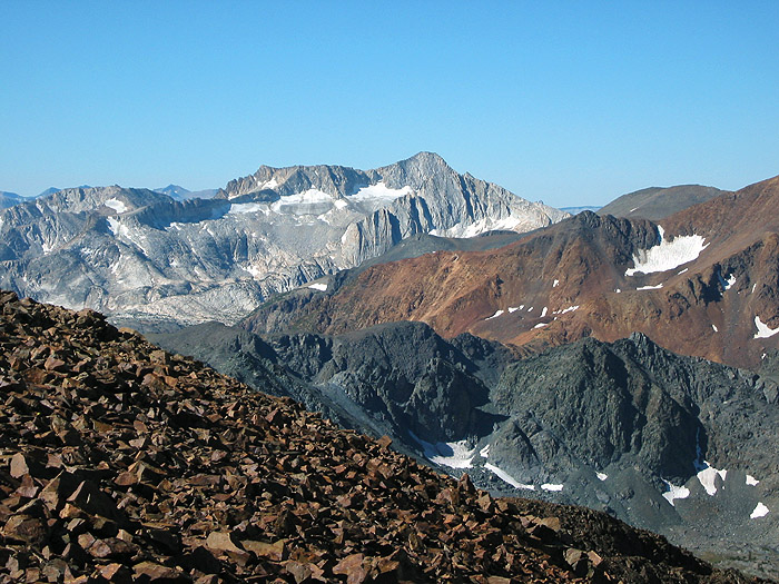 | Zoom on the ever-present Mount Conness from Dunderberg Peak's summit. Various and quickly changing rock hues point to the fact that this region sits on the edge of the Sierra Nevada Batholith. Any rocks in place before the granite's intrusion were cooked and chemically altered by superheated water. |