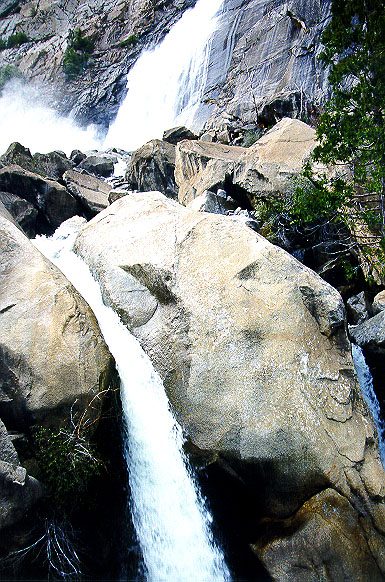 Photo by Kim Lewis. Water cascades down from the heights with a roar.