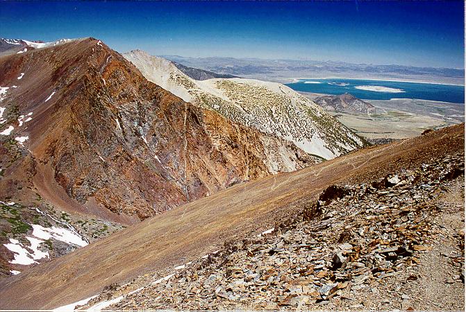 | Classic view from the Koip Peak Pass trail. To the left, the rugged Mount Lewis complex. Parker Canyon is the chasm in the middle. In the distance, Mono Lake and associated recent volcanic cones and craters. Can you see the switchbacks winding down the slope? |