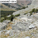 We followed game trails through a verdant forest for a while, but I knew we must be off-route for one simple reason: the official trail climbs 3500 feet in about three miles, and we had barely climbed at all over about a mile. So I repeated to Kim the nearly-unassailable adage: "When in doubt, go uphill." Up, up and away, we moved southeast up a 30° slope, aided in spots by lovely grass. Strenuous, considering that we'd just driven up from sea level. Luckily we generally are not afflicted by altitude sickness. Views are fantastic; better than the standard route's, from what I've heard. Panoramic views from Kuna Crest to Tuolumne Meadows to the omnipresent Mount Conness.