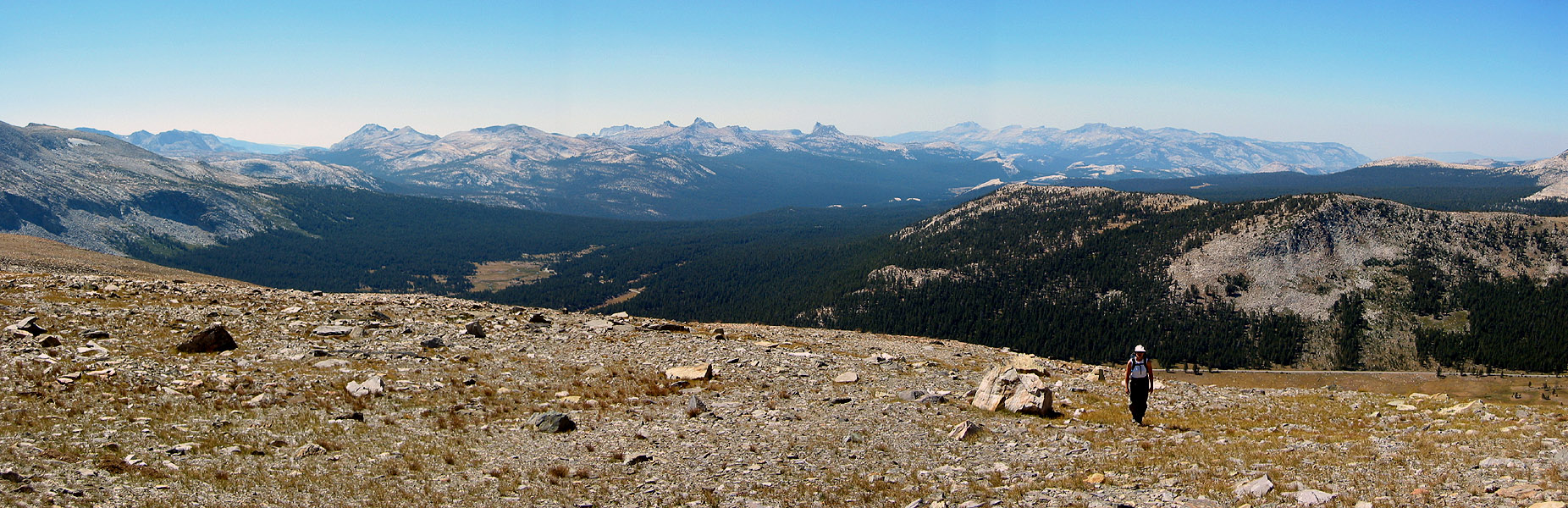 Smoky views to the west (Tuolumne Meadows) from west slopes of Mount Dana.