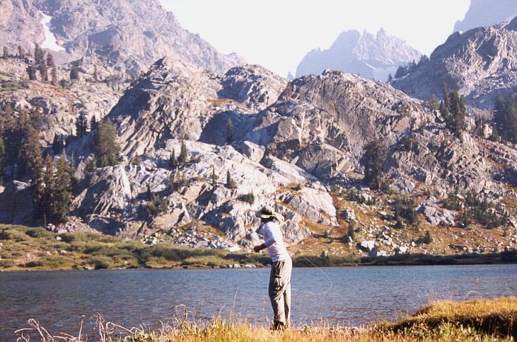 Morgan making power casts into a stiff breeze on Lake Ediza. The fish appear to linger deep until the sun goes below the horizon (about 6:00pm this time of year). Until sunset, surface action is intense.