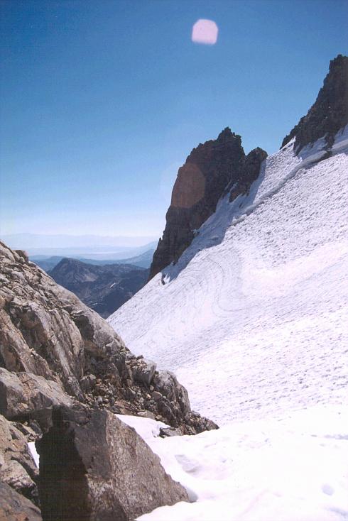 View from near the top of Ritter Glacier, just after we took off our crampons and started up the last push to the summit, 300 meters above us. Notice the beautiful crevasse patterns and exposed bergschrund.
