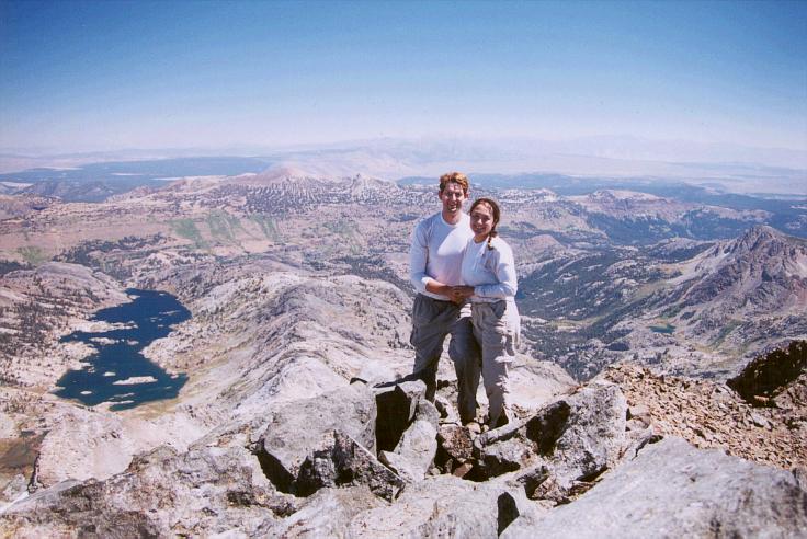 | Success! After an arduous 1200-meter climb, we take in the splendors of Ritter's summit view. The view from three sides is blocked for the entire ascent, so upon reaching the summit, the skies seem to open. Unfortunately, heavy smoke from a forest fire obscured the views to the south and west. |