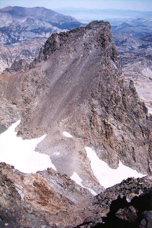 Banner Peak from the summit of Mount Ritter, with glaciers on both sides of the Ritter/Banner saddle. Interested in climbing Ritter's north face? Just look down for a prospective view of your route!