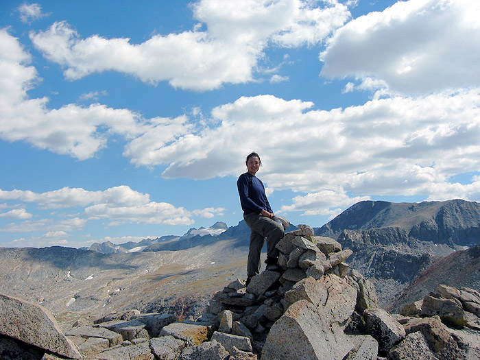 Kim and summit cairn on Peak 11500'. Mounts Maclure and Lyell in the background.